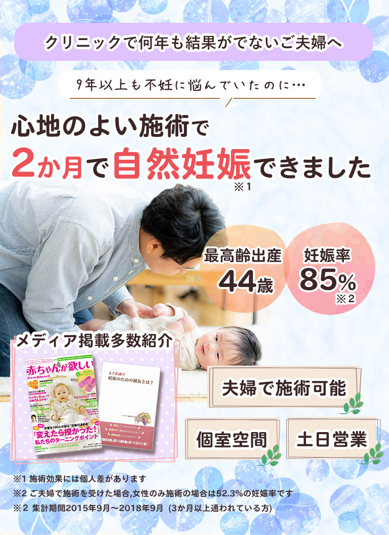 検査を受けたら精子の運動率が、何と数パーセントしかなく、改善のために鍼灸で夫婦で共に施術をしていただきました。