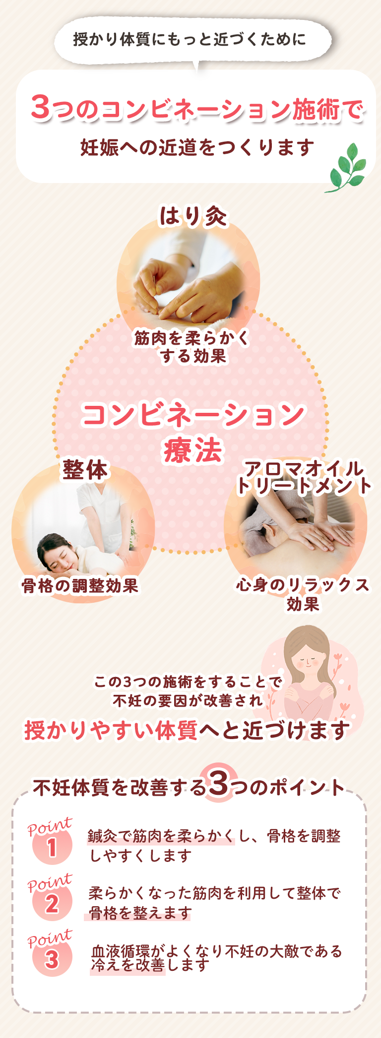 骨格が整っていない状態だと、疲れがたまりやすくなったり、血液の巡りが悪い状態、中には生理不順などの妊娠に強く関係する女性特有の悩みが多くなってしまいます。そのようなことを防ぎ、少しでも赤ちゃんを授かりやすい状態にするために、骨格の調整をしていきます。