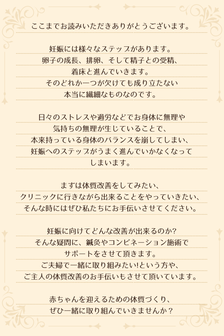 旦那さんにも協力していただいて鍼に通うなどしていただくと良いと思います。