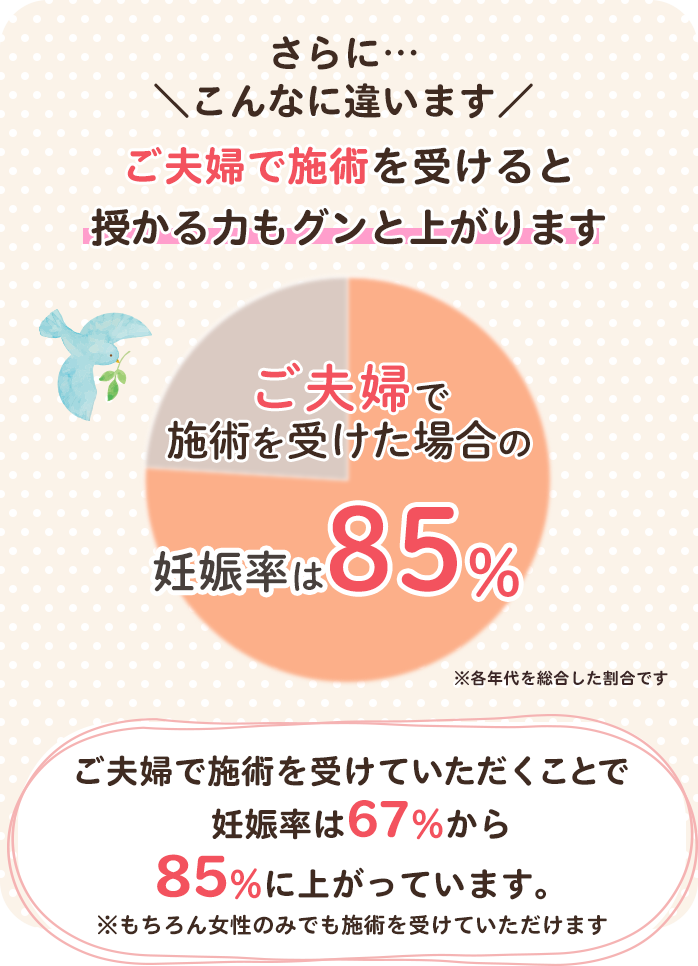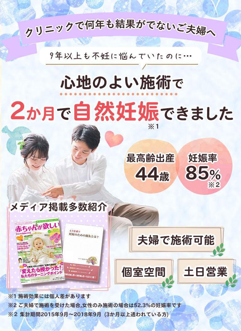 夫は以前精巣の病気を患い、精巣を一つとっていることもあり、系列の錦糸町はり灸院に通うことになり、2人同時に通ったすぐのサイクルで妊娠に至った。(夫婦ともに40代)