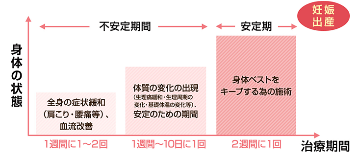 施術開始から、1ヵ月目で良い変化を感じられる方も多くいらっしゃいますが、施術初めの段階の場合、安定して良い状態を維持できないと、もとの身体に戻りやすい不安定な状態です。良い状態を身体に定着させるためにも、出来るだけ定期的な施術を入れられるようにご提案しております。